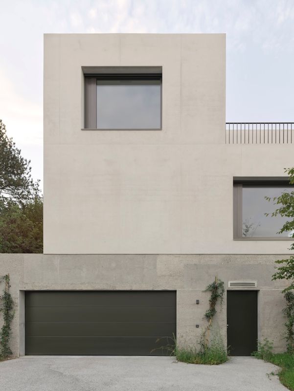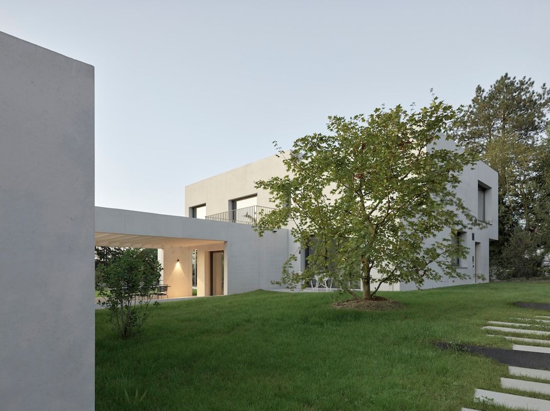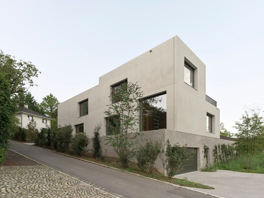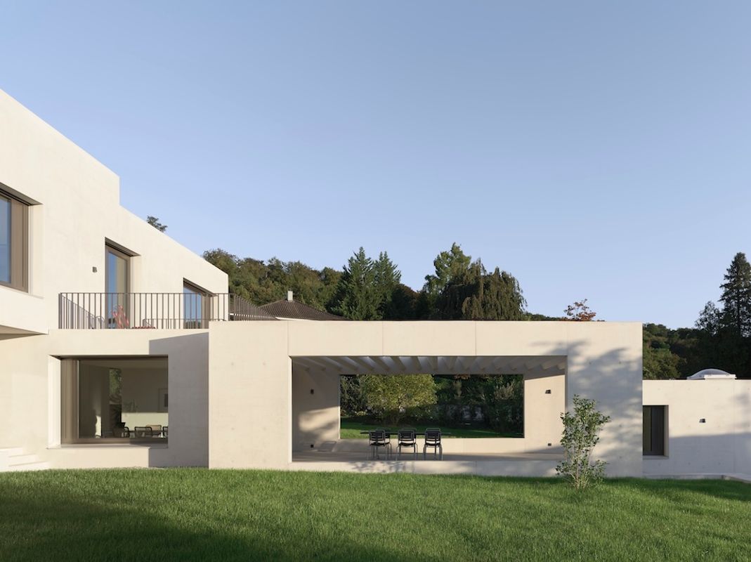 Unweit von Basel entstand in Riehen an schönster Hanglage ein Einfamilienhaus für eine Familie. Das bereits bestehende eingeschossige Haus wurde bis auf den Keller rückgebaut und um ein neues und räumlich vielfältiges Volumen erweitert. Es wurden räumlich interessante Raumabfolgen mit unterschiedlichen Raumhöhen konzipiert. Das Gebäude wurde von aussen um eine grosse Pergola gegen Süden und Westen erweitert. Im westlichen Bereich der Parzelle befindet sich ein Pavillon in welchem eine Sauna, Fitness und ein Gästebereich befindet. Der grosse Garten wurde mit einem Pool ausgestattet. Das Einfamilienhaus wurde aus einem weissen Sichtbeton, welcher von innen verkleidet wurde, konstruiert.