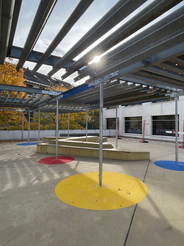 Die Terrassen des gestuften Baukörpers sind im Konzept als Pausen -und Nutzräume für den Unterricht geplant und werden auch so genutzt. Um vor allem in den oberen Geschossen die Nutzungsoptionen aufgrund des Wärmeeintrages zu vergrößern, wurde von Seiten Nutzer:innen ein Projekt zur Beschattung dieser Terrassen angestoßen. Über differenzierte Studien zeigte sich der Vorteil von lamellenartigen, luftdurchspülten und schattenspendenden Elementen, die im Sinne eines klaren Statements durch die Architekt:innen als Re-Use-Elemente definiert wurden. So entsteht eine räumlich präzise Setzung der Schattendächer auf verschiedenen Ebenen auf das mehrfach preisgekrönte Projekt. Gleichzeitig werden zusätzliche Spielangebote geschaffen, die sich unter den neuen Schattendächer entspannt entwickeln können.