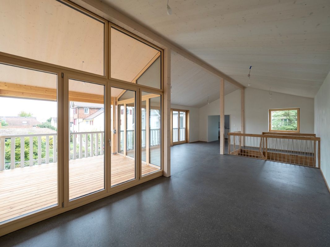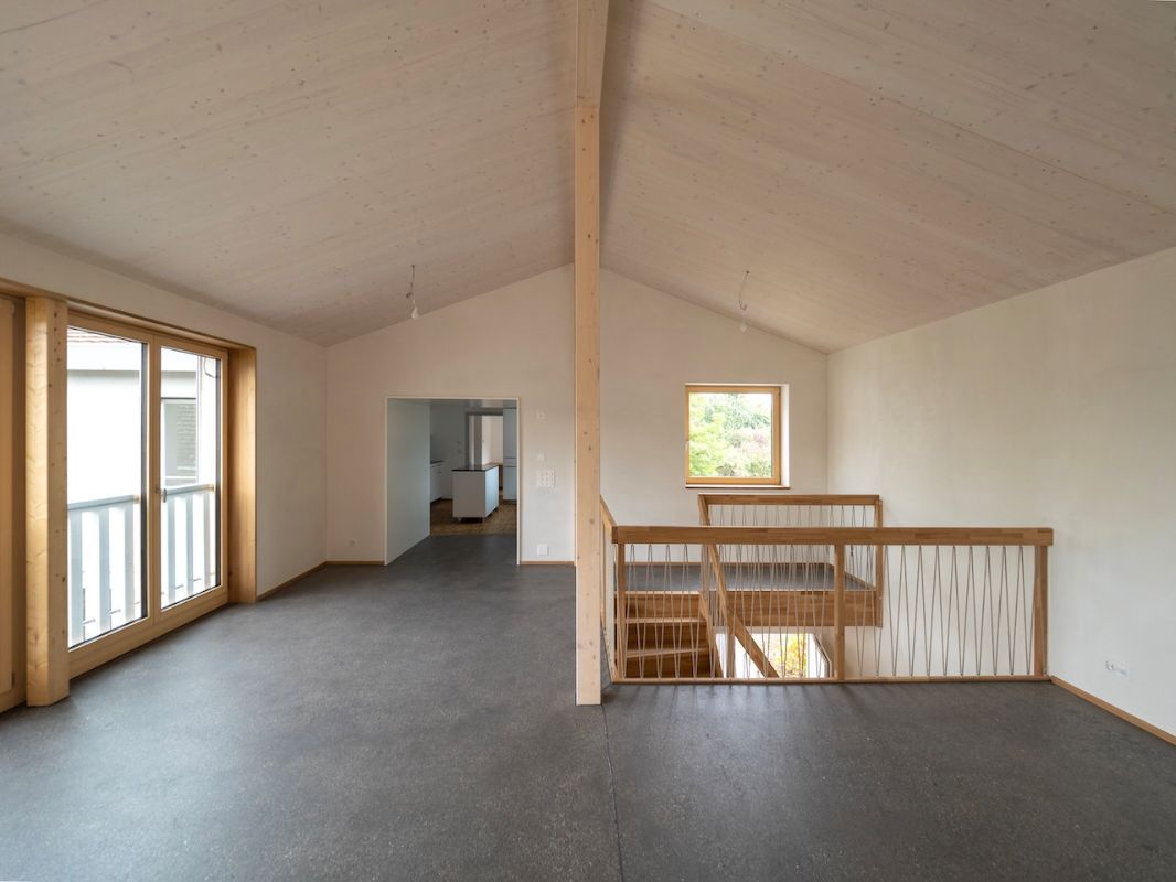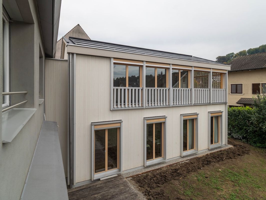 Die ist mit einem hölzernen Anbau – der kleinen Schwester – geschehen. Auch dieses Haus ist entspannt gesetzt, schafft einen schönen neuen Garten, auch hier wird die Wasserführung des (Solar)Daches ein Thema. Das Thema der historischen gemauerten und strassenbegleitenden Häuser mit den gartenseitigen Holzscheunen wird aufgenommen und in einem neuen Zusammenhang diskutiert. Eine differenziert entwickelte Holzfassade reflektiert den kleinteiligen Ort.