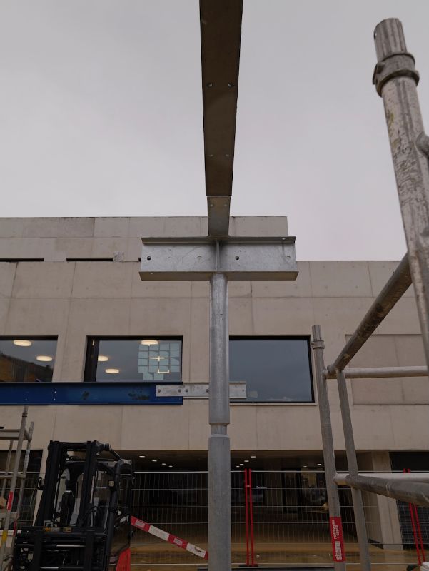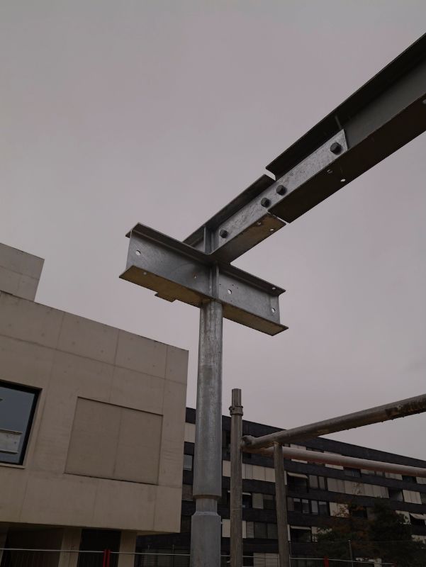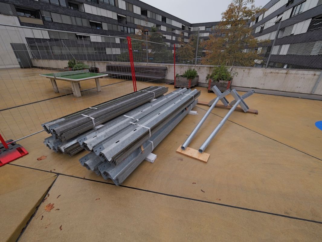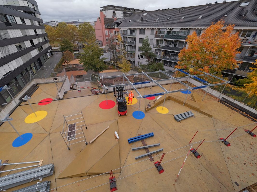 Die Terrassen des gestuften Baukörpers sind im Konzept als Pausen -und Nutzräume für den Unterricht geplant und werden auch so genutzt. Um vor allem in den oberen Geschossen die Nutzungsoptionen aufgrund des Wärmeeintrages zu vergrößern, wurde von Seiten Nutzer:innen ein Projekt zur Beschattung dieser Terrassen angestoßen. Über differenzierte Studien zeigte sich der Vorteil von lamellenartigen, luftdurchspülten und schattenspendenden Elementen, die im Sinne eines klaren Statements durch die Architekt:innen als Re-Use-Elemente definiert wurden. So entsteht eine räumlich präzise Setzung der Schattendächer auf verschiedenen Ebenen auf das mehrfach preisgekrönte Projekt. Gleichzeitig werden zusätzliche Spielangebote geschaffen, die sich unter den neuen Schattendächer entspannt entwickeln können.